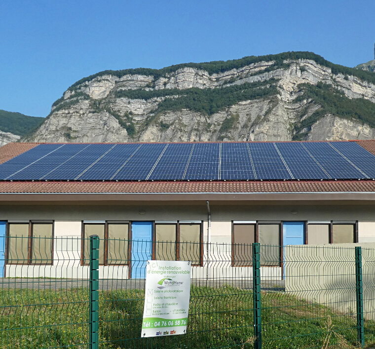 C’est notamment le cas à Crolles, où la toiture de la salle Belledonne, une salle de réfectoire et de réunion qui jouxte l’école Belledonne, est désormais couverte d’environ 200 m2 de panneaux photovoltaïques en intégration simplifiée sur bac acier, pour une puissance maximale théorique de 36 kWc.