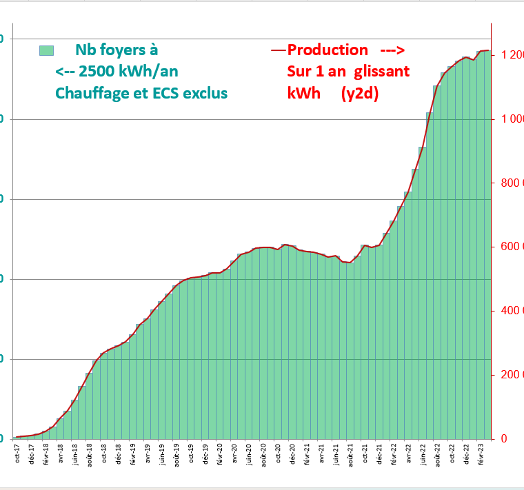 Sur les douze derniers mois glissants, nous avons produit un peu plus de 1 215 MWh soit la consommation annuelle de 486 foyers (voir la courbe historique ci-dessous).