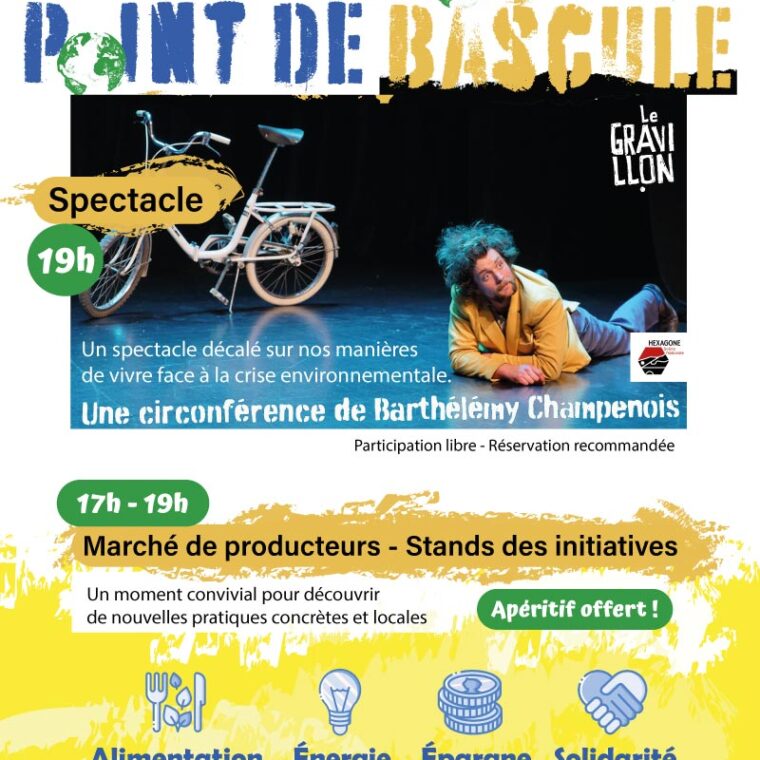 « Point de bascule » est une conférence théâtralisée et burlesque de la Compagnie Gravillon basée à Tullins (38) qui, avec beaucoup d’humour et de poésie, amène de manière décalée à interroger sur les manières de vivre contemporaines et les paradoxes qui animent chacune et chacun face à la crise environnementale.